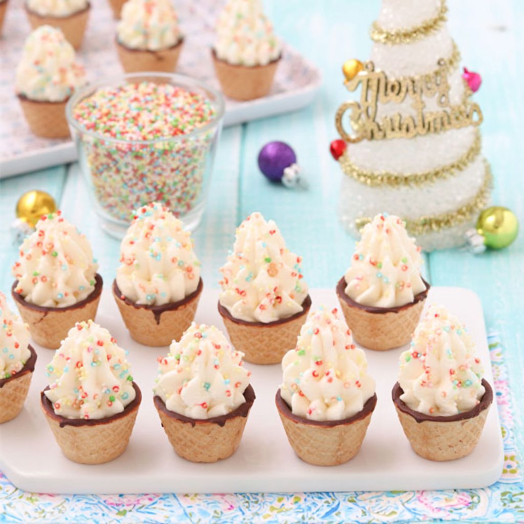 Decorate the mascarpone cream trees with colorful sprinkles, and your Christmas trees are ready!