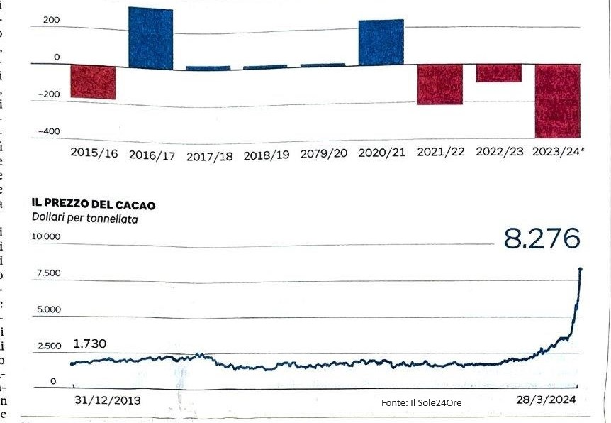 La filiera del cacao nel 2024 è in grande stress. Dal 1° gennaio 2024 da $1.730 a tonnellata a $8.276, quasi 5 volte tanto. Faremo a meno del cacao? Dove non serve, sì.