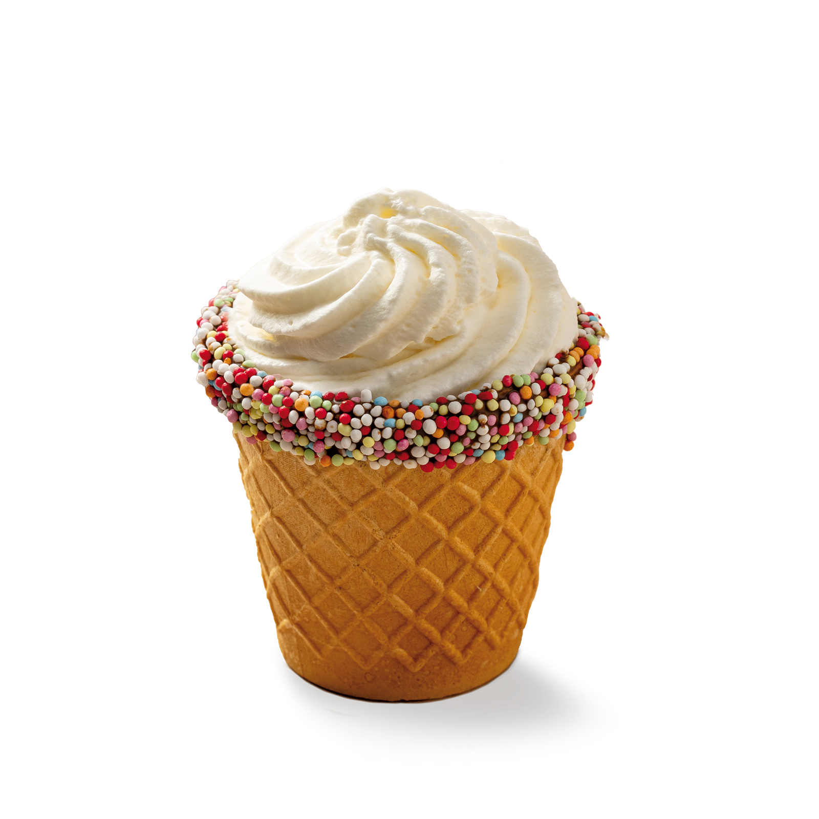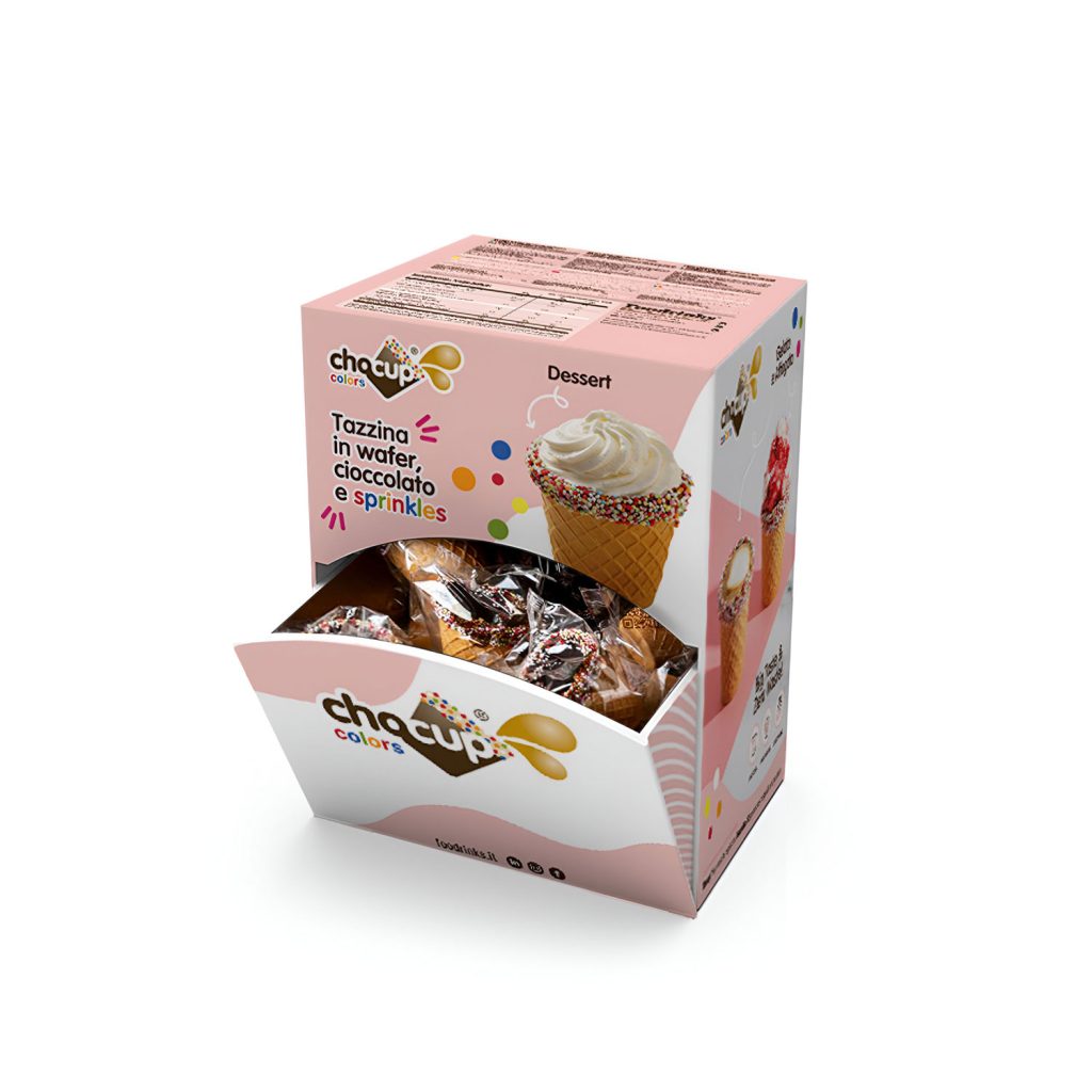 Tazzina in wafer da 60ml, ricoperta di cioccolato fondente belga e palline di zucchero colorate (sprinkles): l’ideale per colazioni, merende, snack dolci.